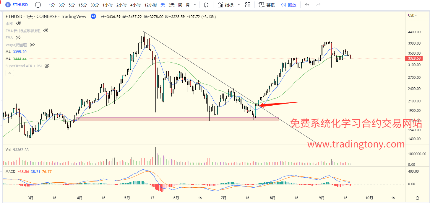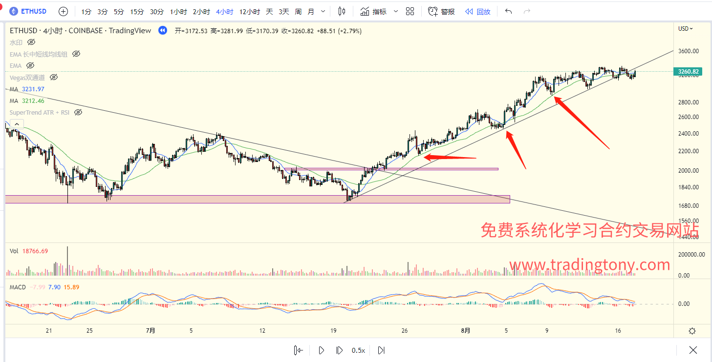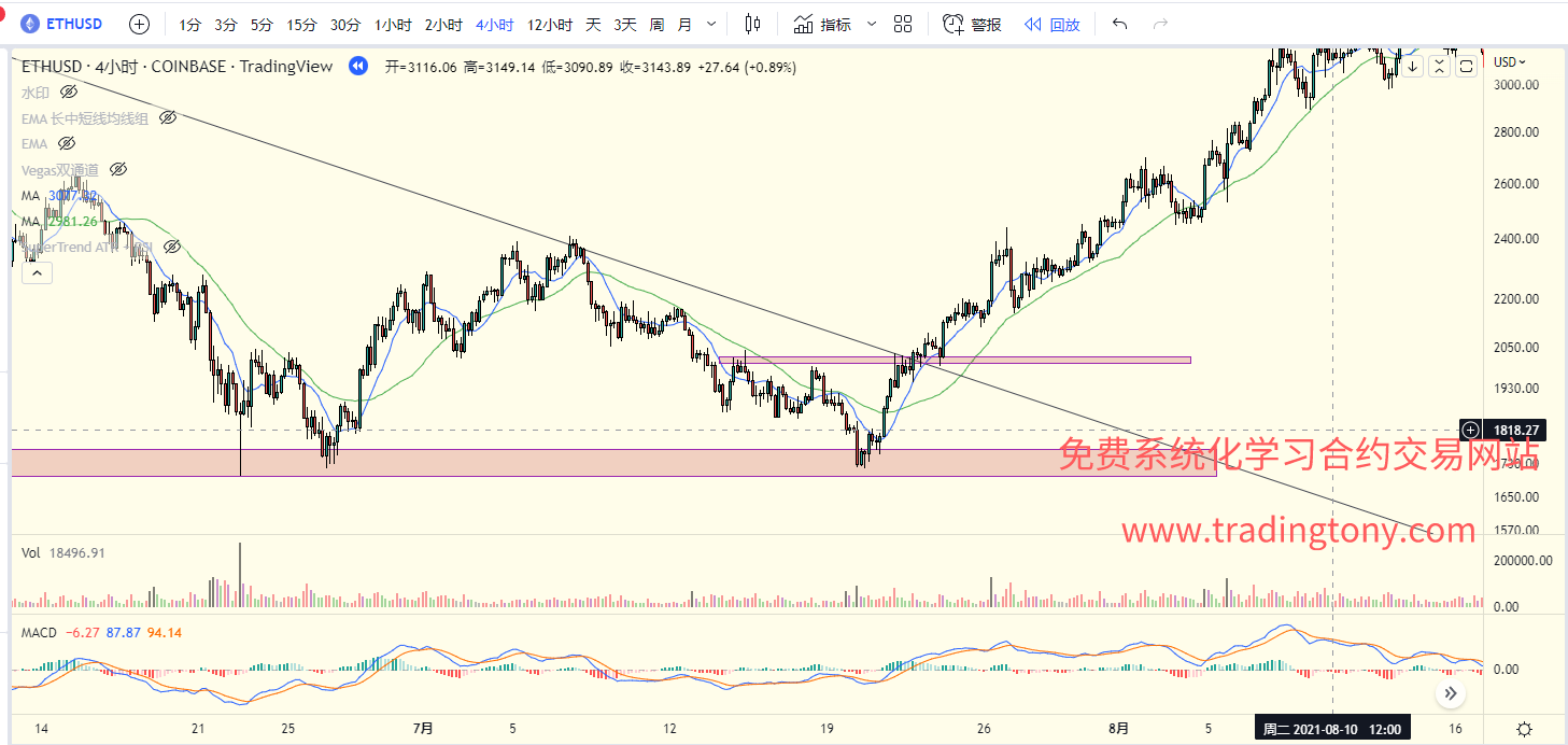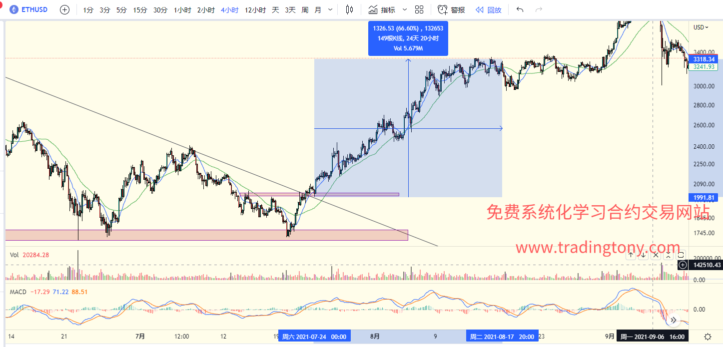 趋势线是后面画的,不具备前期参考作用,4H图表上,当然你也可以参考更低的周期,寻找滚仓的方式或者是金字塔加仓法则